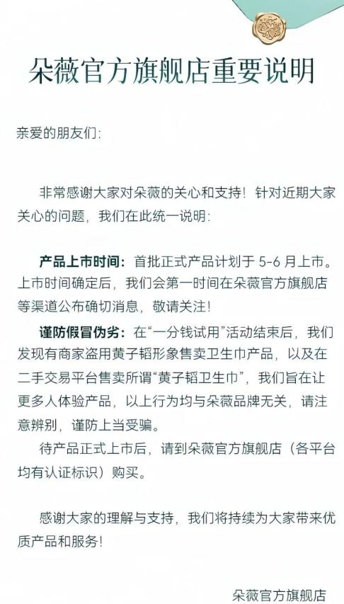 ▲二手平台出现高价倒卖的卫生巾针对“一分钱试用”活动结束后出现的各种乱象,4月12日,朵薇发布官方声明,明确表示首批正式产品计划于5-6月上市,同时强调任何盗用黄子韬形象销售卫生巾以及在二手平台售卖所谓“黄子韬卫生巾”的行为,均与朵薇品牌无关。