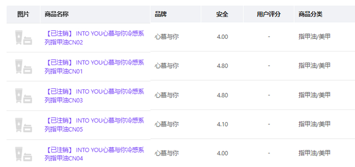 记者在美修大数据也进行了查询,发现这款INTO YOU心慕与你冷感系列指甲油CN02,连同其它色号的同类产品均已注销。