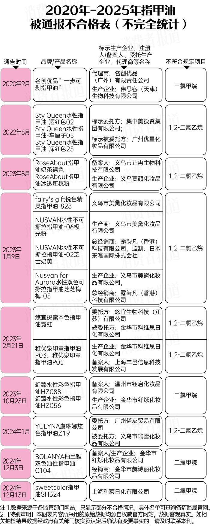 据《消费者报道》不完全统计,在近几年的指甲油抽检中,1,2-二氯乙烷、二氯甲烷、三氯甲烷经常被违禁添加到指甲油中,成为危害消费者健康的隐形杀手。