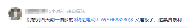 有投资者在社交平台上表示,“没想到四天翻一倍多的精进电动又连板了。这票真暴利。”也有投资者表示,“发现这票已经20cm四板,但是热度出奇的低。”