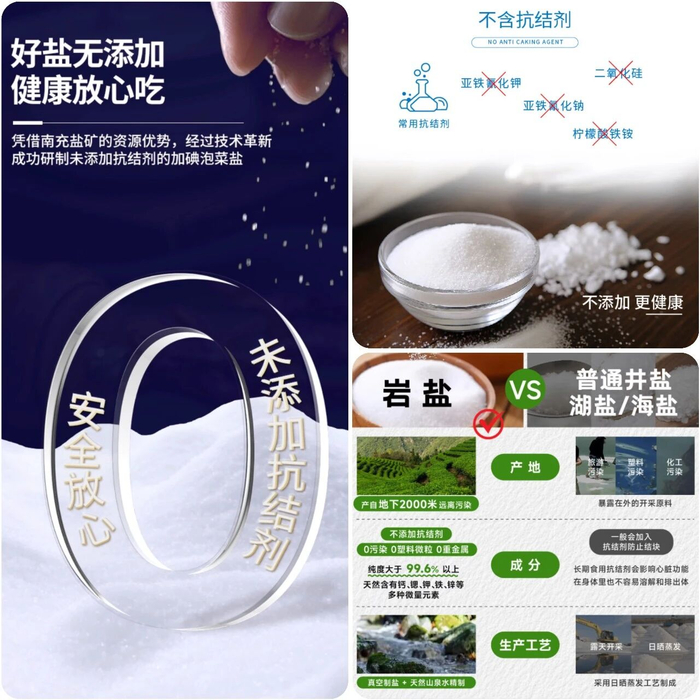 有趣的是,尽管适量使用抗结剂是行业常规,但“未添加抗结剂”“不含亚铁氰化钾”等却成了部分产品的营销卖点。例如,白象牌、闽盐、川晶、颂康制盐等均强调在生产过程中未使用任何抗结剂。