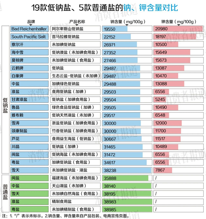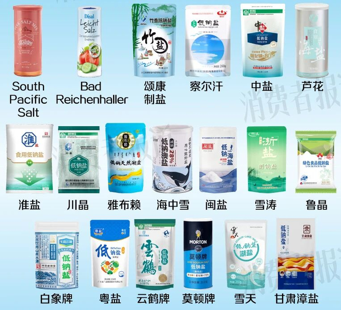 为了解市售主流低钠盐的配方及减钠幅度,《消费者报道》对比了市面上销量靠前的19款低钠盐。结果显示,这些低钠盐的核心配方基本一致,19款产品的配料表首位为盐,次位为氯化钾。