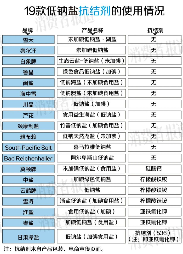 在19款低钠盐中,7款使用了抗结剂,其中莫顿牌使用了硅酸钙,中盐、云鹤牌、雪涛使用了柠檬酸铁铵,淮盐、粤盐、甘肃漳盐则使用了亚铁氰化钾。