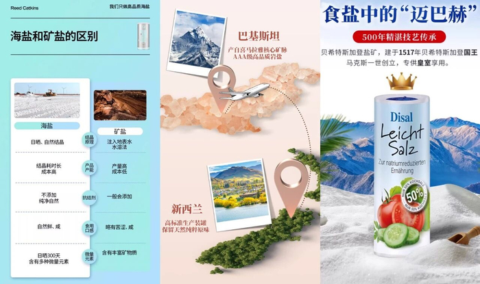 从原料来看,海盐、湖盐、岩盐产品的价格普遍高于最常见的井矿盐。例如,芦花食用益生海盐(低钠盐)在宣传中着力突出海盐的种种优势,并宣称“只做高品质海盐”,一罐(450g)的售价为18.2元;South Pacific Salt宣称“产自喜马拉雅核心矿脉AAA级高品质岩盐”,一罐(280g)的售价为44元;而Bad Reichenhaller更以“食盐中的‘迈巴赫’”“专供皇室享用”为卖点,一罐(250g)的售价高达72元。此外,强调“生态”“天然”“益生”等概念或添加特殊成分(如海藻糖、竹香)的产品价格也通常更高。