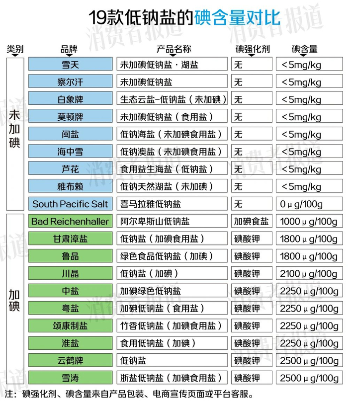 在此次对比的19款低钠盐中,10款为“加碘低钠盐”,1款为“未加碘低钠盐”。