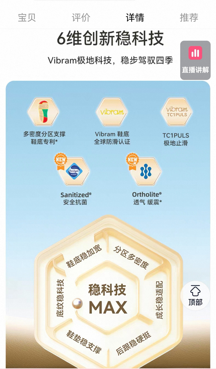 泰兰尼斯以“稳”精准吸引了包括岑舒在内的新手父母的注意。在泰兰尼斯相关产品的宣传中,其使用的顶配Vibram橡胶鞋底、Ortholite 透气缓震、TC1PULS极地止滑、多密度分区支撑鞋底专利等先进技术及材料,支撑了稳稳鞋的防滑性能。