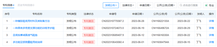 尽管泰兰尼斯宣称拥有多项专利技术,但从其专利构成看,外观设计类专利占比较高。天眼查信息显示,泰兰尼斯主体运营公司杭州泰潼目前有96条专利信息,其中84条为“外观设计”、8条为“实用新型”,而仅4条为“发明公布”,分别涉及鞋架、鞋垫、鞋底、学步鞋,但法律状态均为“专利撤回”。