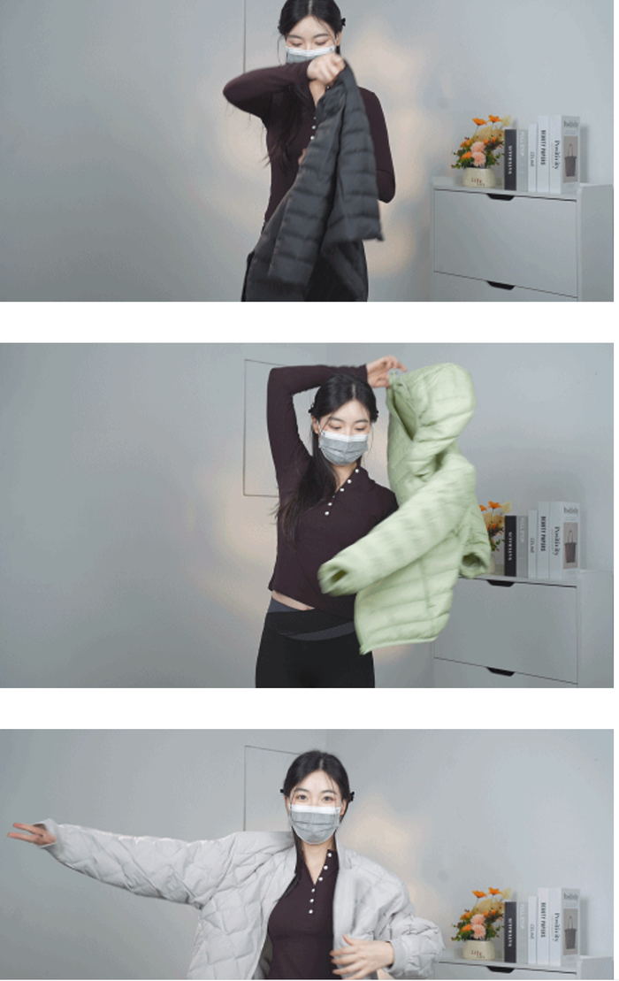为了了解羽绒服多次穿脱后的防钻绒性能和防静电状况,我们邀请了一位志愿者依次对9款羽绒服进行了数十次的穿脱测试,共穿脱了数百次。
