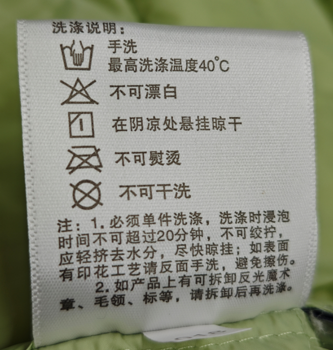 (3)按照标签说明进行洗涤护理。羽绒服被不宜过多洗涤,会降低羽绒的蓬松度,进而降低保温效果。日常清洁时,可用擦拭代替清洗。如确有需要,应按产品明示的方式进行洗涤,使用专用或中性洗涤剂,轻柔擦洗,不建议拧干或甩干,应轻挤去除水分,平铺或悬挂晾干后轻轻拍打,使羽绒服恢复蓬松柔软。