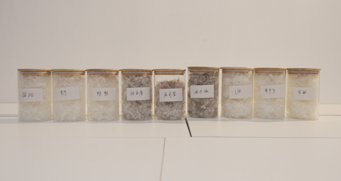 在进行现场衣服试穿、羽绒材质观察环节之前,我们对9款羽绒服稍做剪破处理,进行羽绒材质取样,并将每款内部羽绒分别存放于9个透明玻璃罐中。
