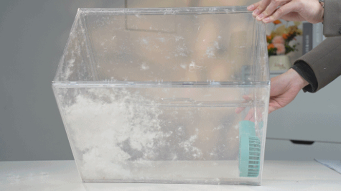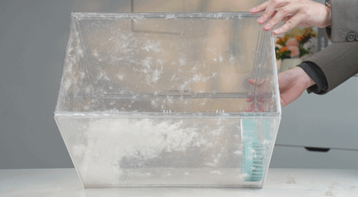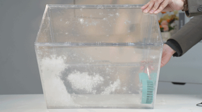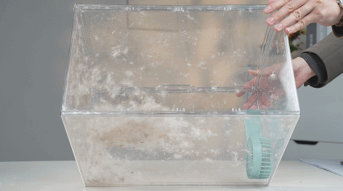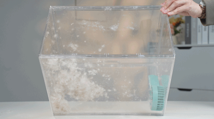 为了可以直观地观察羽绒服内部填充羽绒的轻盈程度,我们设计了一个小实验室:拆出9款羽绒服的内部羽绒,分别用电子秤称量1克,置于测试箱中,每次均用小风扇固定的档位吹动,查看羽绒飘飞状况。