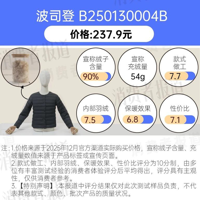 ▲9款羽绒服对应的内部羽绒随后,多位参加本次主观测评的消费者从款式做工、内部羽绒、保暖效果、性价比四个维度对9款入门羽绒服进行了试穿、观察和主观评分。