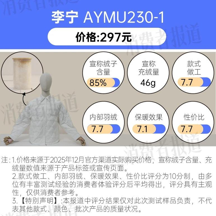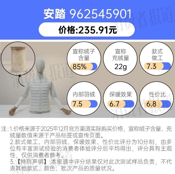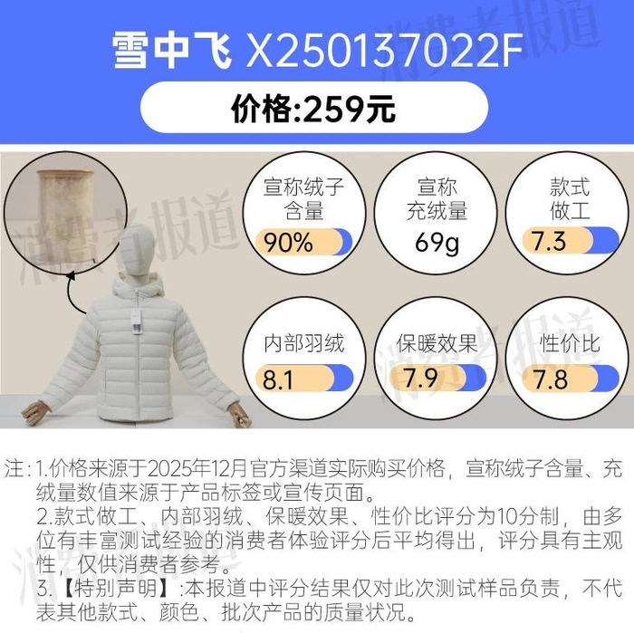 值得一提的是,羽绒的飘飞状况跟羽绒的蓬松程度、大小形态、位置分布等多种因素有关,因此此次试验并不代表各羽绒服的质量状况,仅供消费者参考。