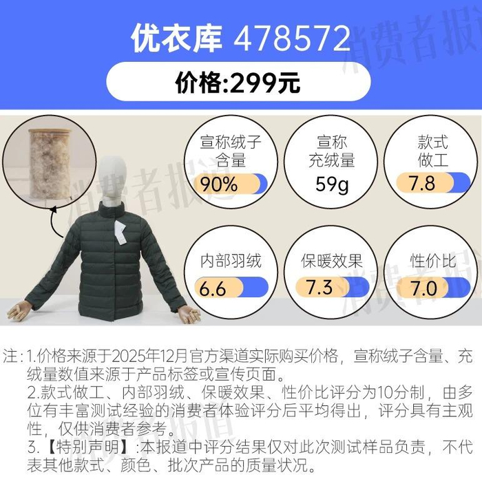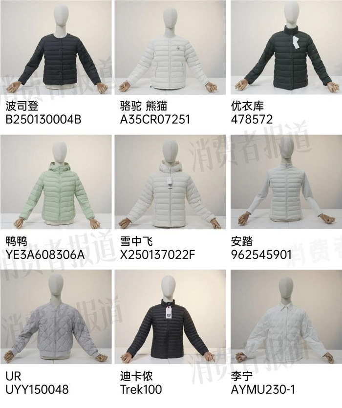 究竟该如何选购一件称心如意的羽绒服呢?近日,《消费者报道》采购了9款市面上较热销的入门级羽绒服进行对比,售价在180元~350元之间,品牌及货号分别为波司登 B250130004B、骆驼 熊猫A35CR07251、优衣库 478572、鸭鸭 YE3A608306A、雪中飞 X250137022F、安踏 962545901、UR UYY150048、迪卡侬 Trek100、李宁 AYMU230-1。