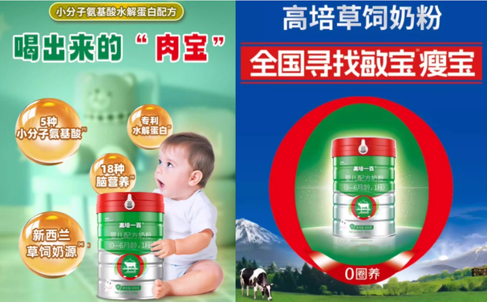 如在高培旗舰店中,高培一百普通婴配奶粉1段(0-6月龄,1段)的产品详情页面显眼位置,可以看到“全国寻找敏宝、瘦宝”“专利水解蛋白”“5种小分子氨基酸”“好吸收”等大号字体广告文字。