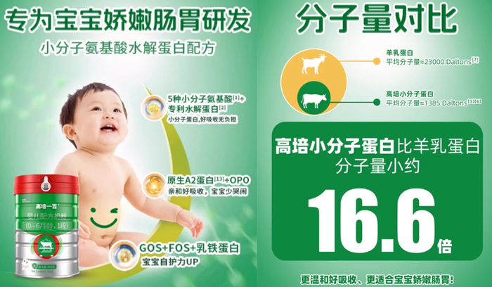 此外,该品牌还宣称,产品专为宝宝娇嫩肠胃研发,采用小分子氨基酸水解蛋白配方,并通过与羊乳蛋白分子量对比,强调自身更温和易吸收的优势。
