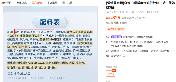 而爱他美官方旗舰店客服则表示:“该款产品并非直接以水解乳清蛋白粉为原料,而是以脱盐乳清粉和乳清蛋白粉为原料,经水解工艺分解成小分子乳蛋白、肽段和氨基酸。”