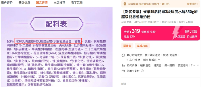 对比之下,在特医婴配适度水解蛋白奶粉的配料表中,水解蛋白成分均处于靠前位置。如雀巢超启能恩3段(1-3岁)适度水解蛋白奶粉,水解乳清蛋白和乳糖混合物排在配料表首位。