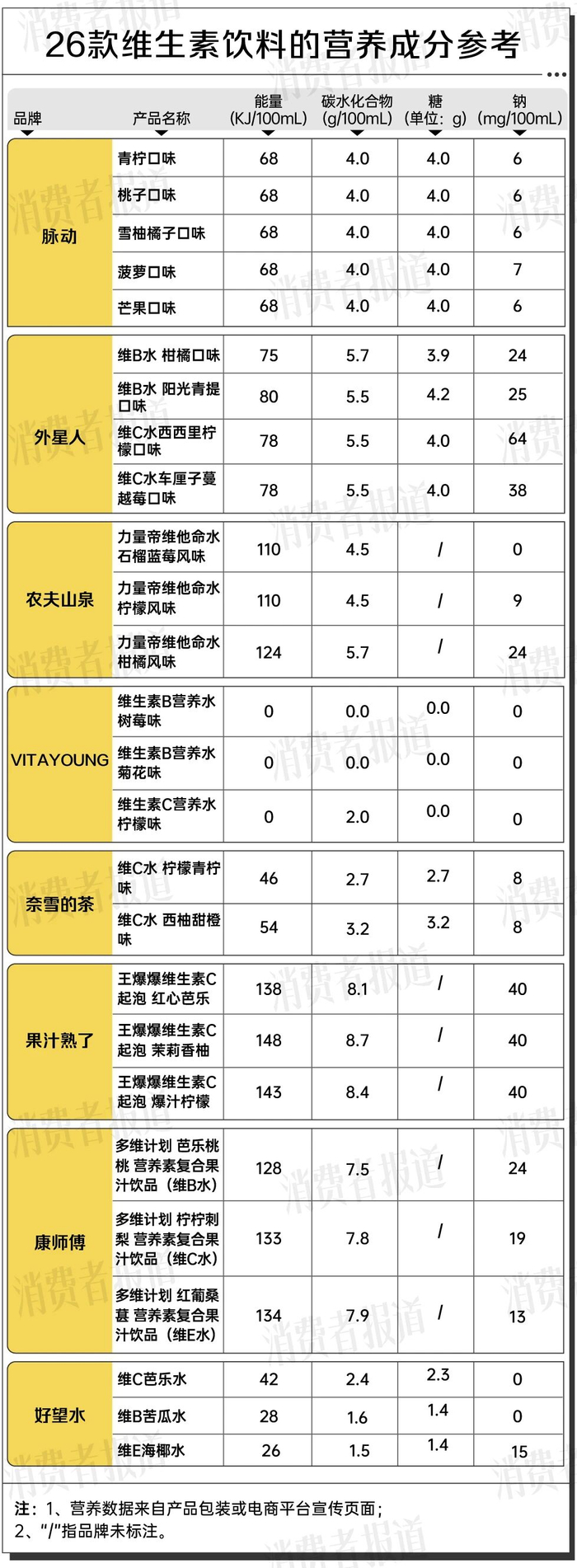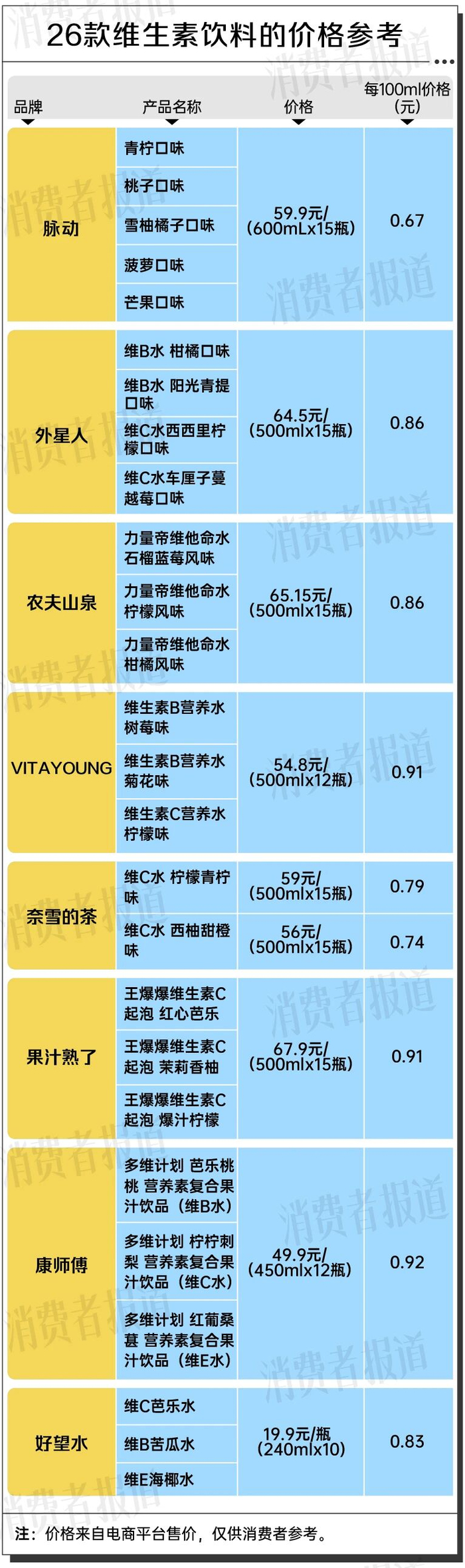 而在维生素含量和种类方面,此次对比的26款维生素水各有侧重。以维生素C为例,多数产品的含量约为20毫克/100毫升,即一瓶500毫升的饮料可提供约100毫克维C,基本达到《中国居民膳食营养素参考摄入量》中成年人每日推荐摄入量。