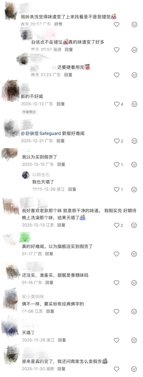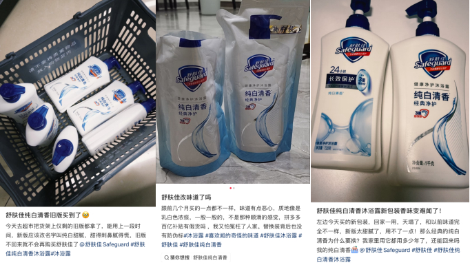 例如,舒肤佳经典产品健康净护沐浴露(标注“纯白清香”),目前已升级标注为“长效保护”。不少消费者在社交平台和商品评论区反映这款产品升级后气味变了,无法接受,甚至以为买到了假货。