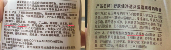 《消费者报道》记者发现,在同样宣传咖啡香型的洗护产品中,香味成分似乎不尽相同。在部分产品外包装的成分表中,与咖啡字眼相关的是“咖啡提取物”,而在舒肤佳“栗香奶咖”沐浴露的外包装成分中未见与咖啡相关字眼,与香味相关的成分为“(日用)香精”。