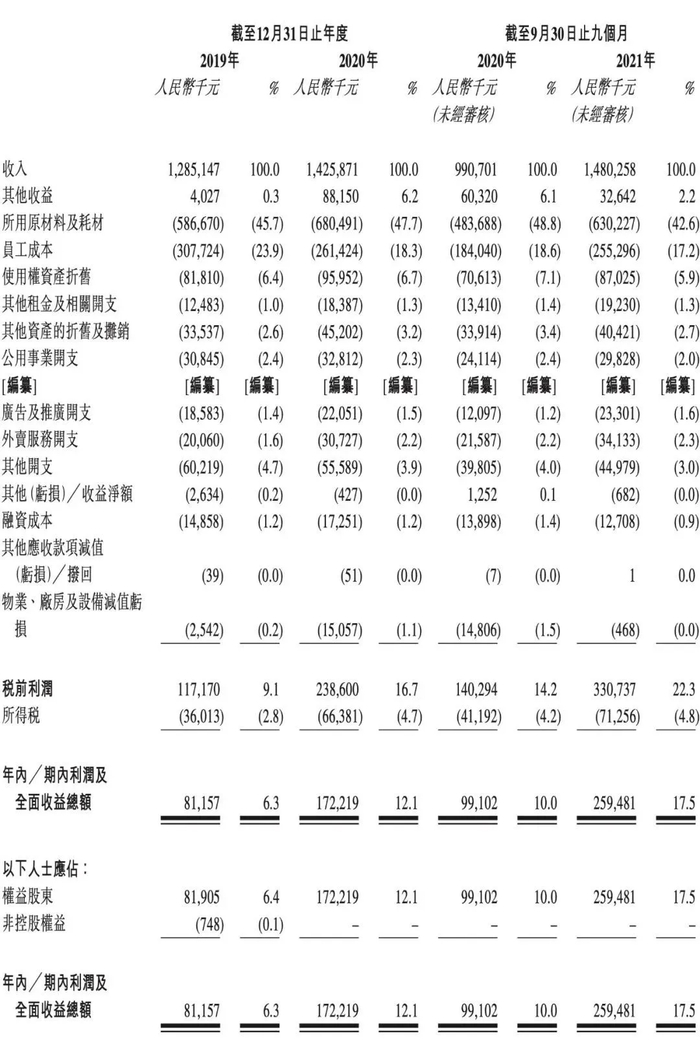 疫情期间餐饮业的闭店潮中,七欣天仍保持出色的财务业绩,不减反增,表现出强大的抗风险能力。从2019年至2021年9月30日,七欣天营业收入分别为12.85亿元、14.26亿元、和14.80亿元。净利润分别为0.81亿元、1.72亿元和2.59亿元,净利率由6.3%增长至17.5%。反观已经上市的海底捞和呷浦呷浦,2021年上半年两家企业的净利率仅为0.48%和-1.63%。