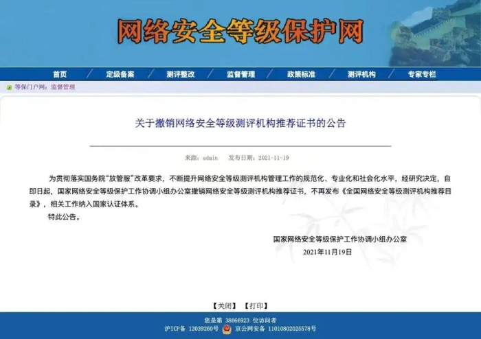 2021年11月19日,国家网络安全等级保护工作协调小组办公室发布了《关于撤销网络安全等级测评机构推荐证书的公告》。