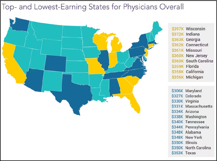 另外,美国医生收入还有一点与中国极为不同:不是经济越发达地区收入越高!地域差异整体不大,但收入最高的往往不是富庶地区: