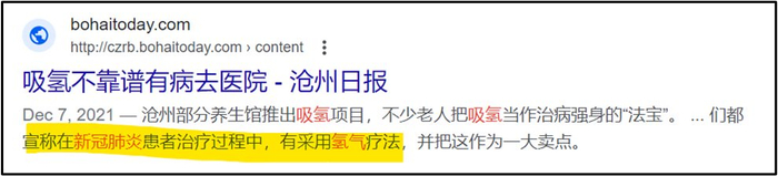 沧州的新闻里我们也看到了一条非常重要的线索:氢气养生馆彼时推销的一个卖点是能治新冠。