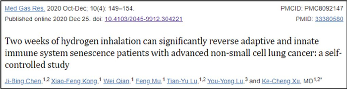 两篇论文间隔不到半年,均发表2022年影响因子高达2.9的Medical Gas Research期刊上。其中一篇显示20名晚期肺癌患者,吸氢气两周后,成功逆转免疫抑制,体内有更多杀伤性免疫细胞: