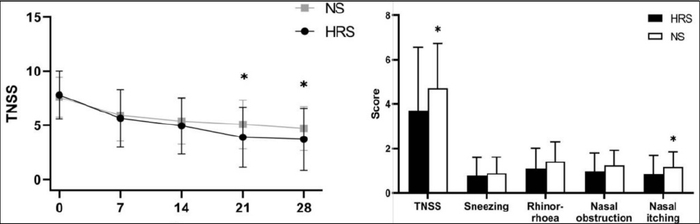 该研究组最新一篇论文发表于2022年,招募了120人受试者,实际入组103人。结论当然还是有效:使用含有氢气的生理盐水连续灌洗鼻腔四周(28天,每天两次),患者的总体鼻腔症状评分(TNSS)下降更多,具有统计学显著性: