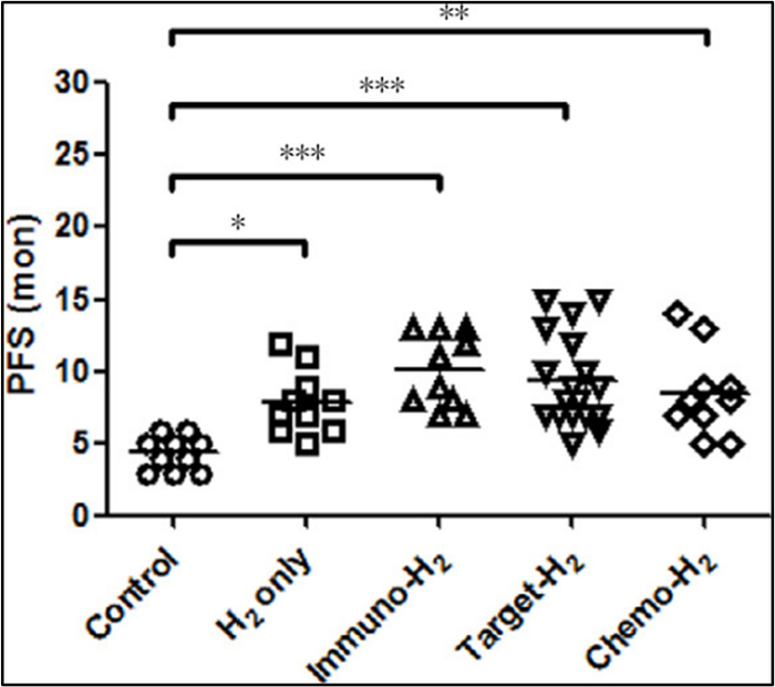 未用任何治疗的对照组肿瘤无进展生存时间(PFS)是4.4个月,仅用氢气治疗PFS就增加到7.9个月,化疗+氢气是8.5个月,靶向治疗+氢气是9.4个月,免疫治疗(K药或O药)是10.1个月。
