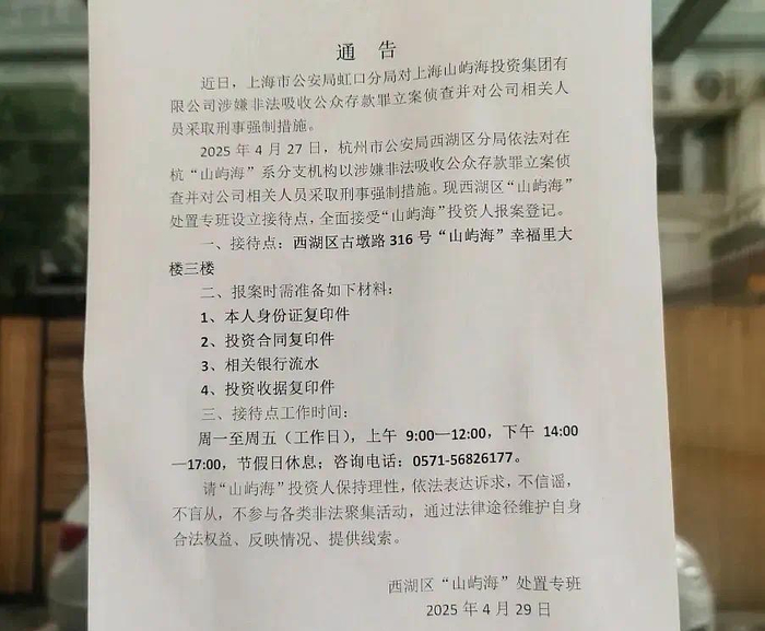近日,据杭州西湖区“山屿海”处置专班通告显示,杭州市公安局西湖区分局依法对在杭“山屿海”系分支机构以涉嫌非法吸收公众存款罪立案侦查并对公司相关人员采取刑事强制措施。