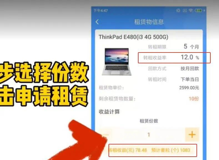 麦子租赁官方平台显示,该平台提供华为和小米多款手机的租赁,不同产品的转租期限、转租收益率、租赁物品单价均不同,租赁收益率可达9.9%-12%。