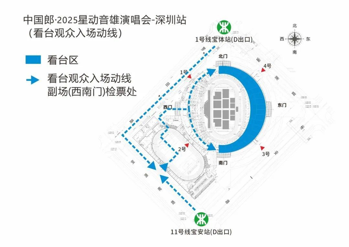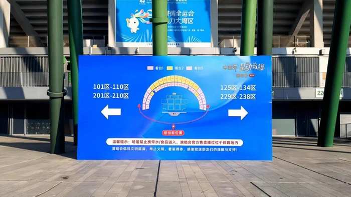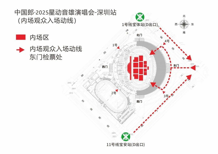 内场观众:请从体育场东门检票处进入,通过3号/4号口入场。