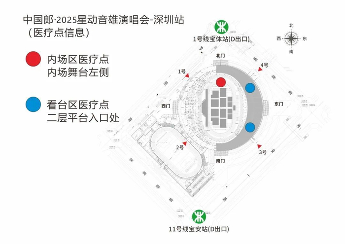 如感不适,请前往内场舞台左侧或看台区二层平台入口处的医疗救护点。