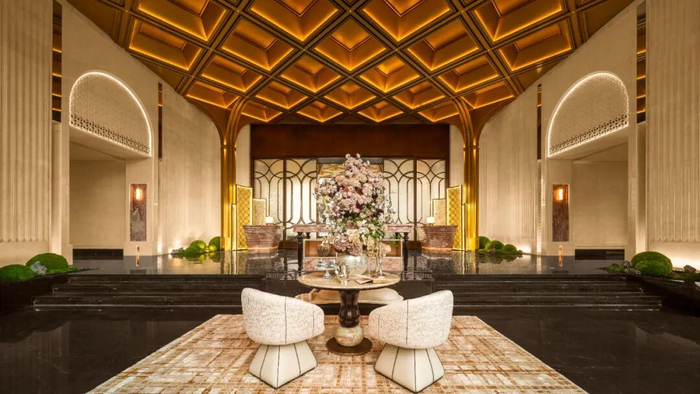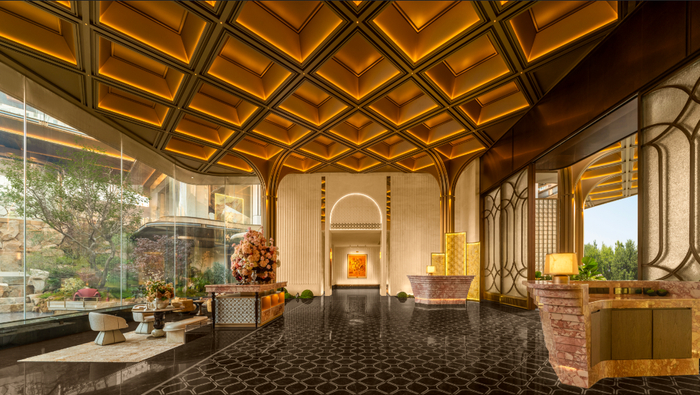 探访当日现场,首先映入眼帘的是近51米酒店式礼仪门厅开启归家序章,20根7米高香槟金立柱彰显非凡气度,给到了前来的参观者直接视觉冲击,仿佛瞬间被带入一个奢华而宁静的专属领域。