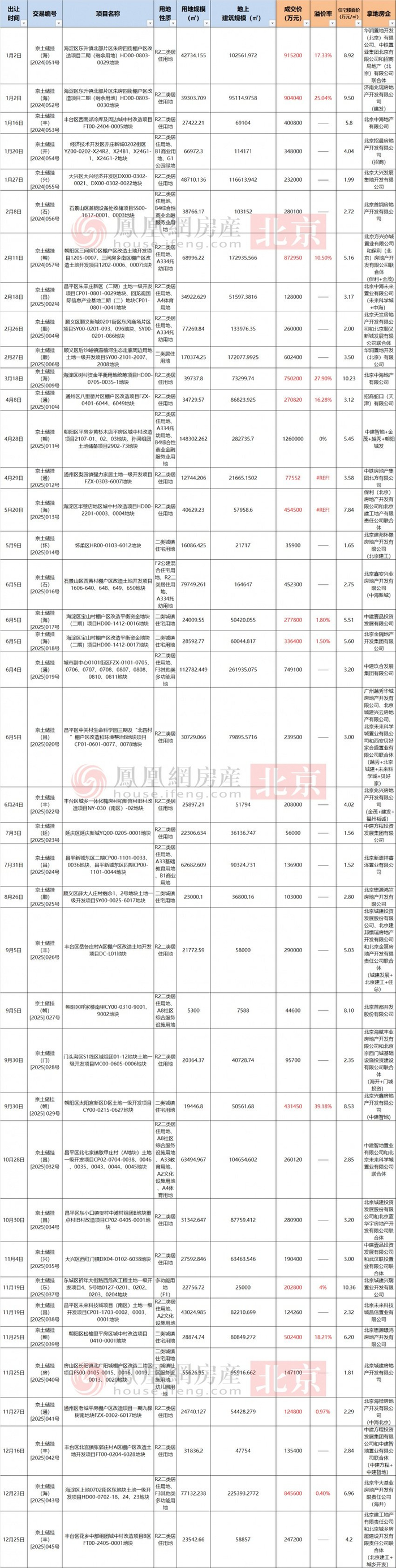 以下为2025年北京土地市场涉宅地块成交数据表: