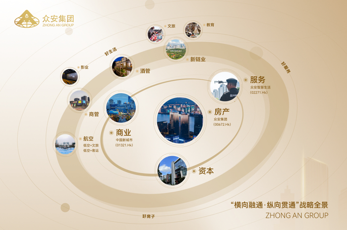 众安最具差异化的优势,在于其“横向融通 纵向贯通”的产业生态。房产、商业、服务、资本四大板块,不是独立运营的子公司,而是在项目层面深度咬合的齿轮。