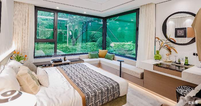 全维精工考究的居室空间,深研区域高端改善客户需求,奢配巨幕落地窗宽景客厅,以及270° 转角飘窗边户主卧,让居室与室外自然风光无界交融。