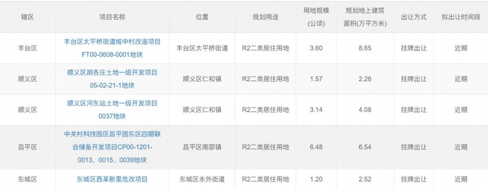 本轮推出的地块全部位于市场需求突出、基础设施和公共服务配套较完善的区域。从区域分布来看,核心区1宗(东城区)、中心城区1宗(丰台区)、平原多点地区3宗(顺义区2宗、昌平区1宗)。具体如下:
