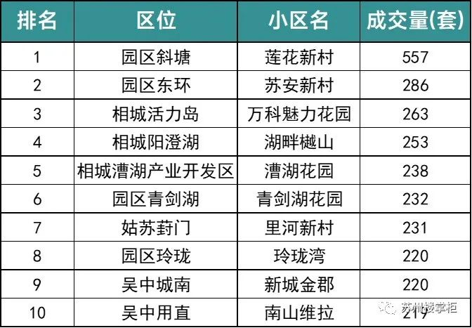 从全年排名前10的小区来看,排在榜首的还是园区大规模安置房小区莲花新村,年度网签557套,较去年增加了近百套。凭借在园区范围内低单价低总价的优势,以及较为不错的地理位置,还是相当吸引经济能力有限的刚需群体上车。