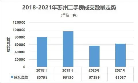 根据住建局数据显示,2021年苏州二手房全年成交63037套,相比于2020年成交57389套,成交量上涨9.8%。但与2018、2019年的风口时期相比,成交量下降的幅度较为明显。