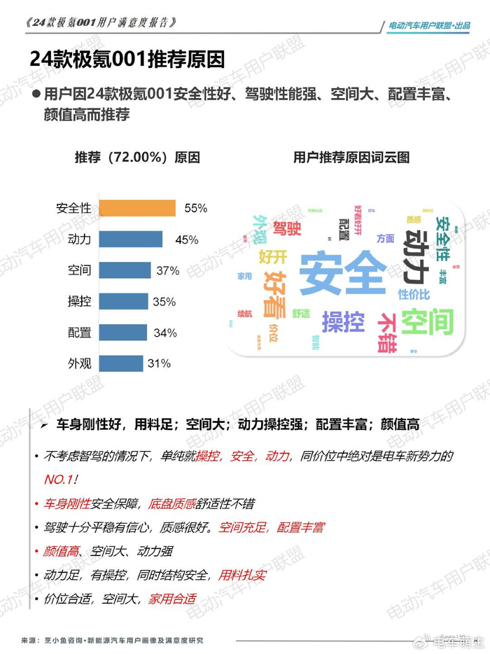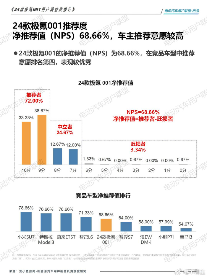 5.24款极氪001用户净推荐值(NPS)为68.66%,用户推荐意愿较高,主要推荐因是安全性好、动力强、空间大、操控好和配置高;中立用户占比24.67%,贬损用户占比3.34%,中立及贬损因主要是对智驾、售后服务和续航不满。