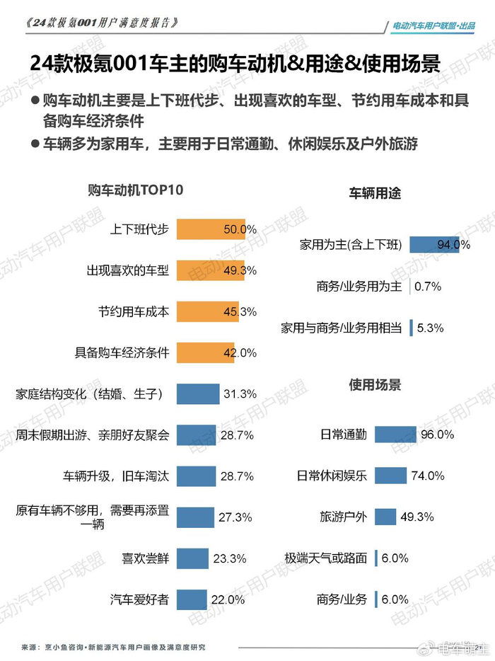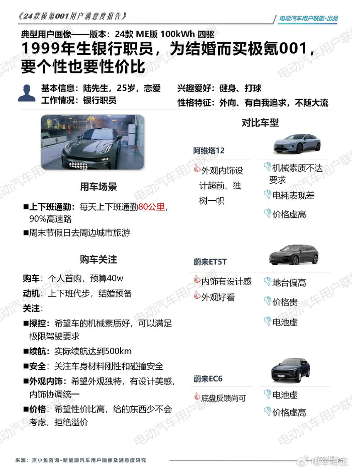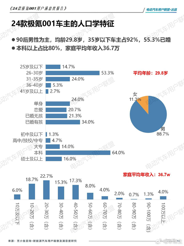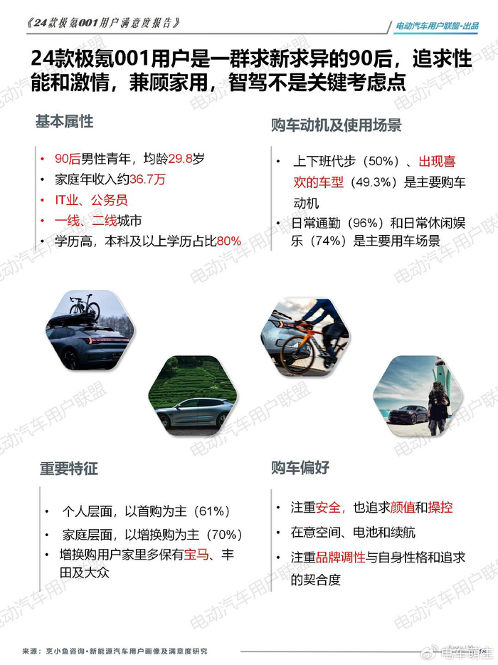 1.24款极氪001用户是求新求异的90后,均龄29.8岁,80%以上本科学历,家庭平均年收入36.7万,他们追求性能和激情,想要运动也想兼顾家用。