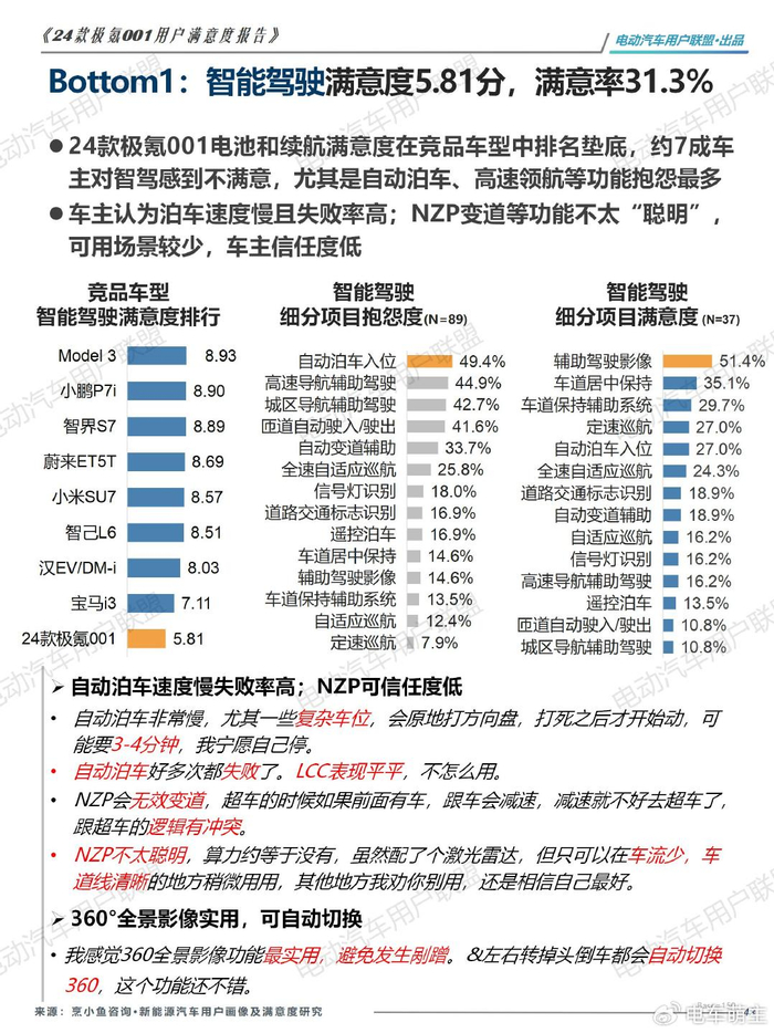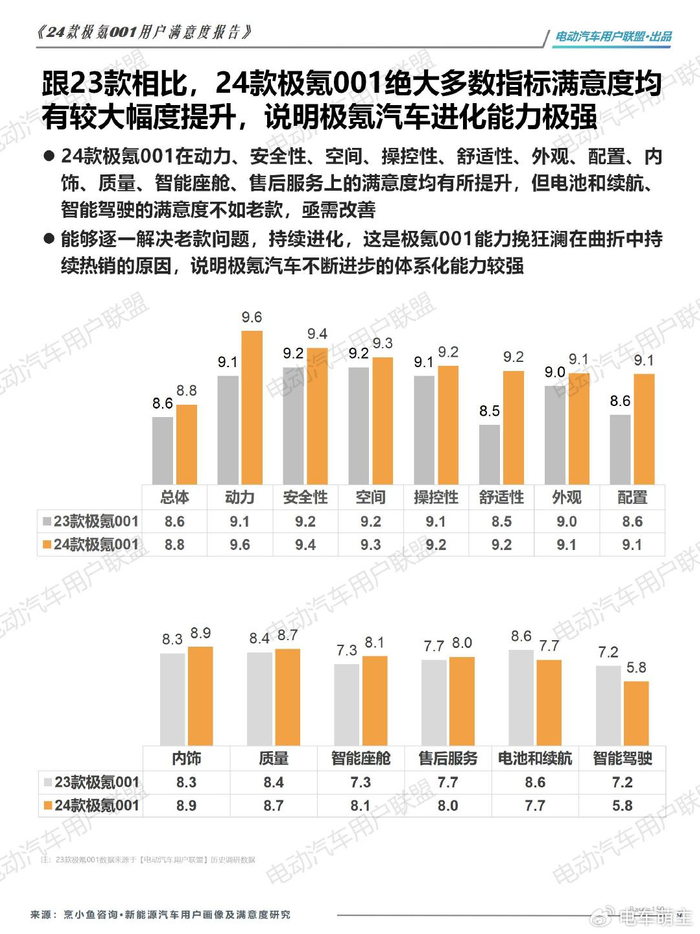 6.跟23款相比,24款极氪001绝大多数指标满意度均有较大幅度提升,说明极氪汽车进化能力极强;跟竞品相比,24款极氪001有8个指标领先,有5个指标落后。