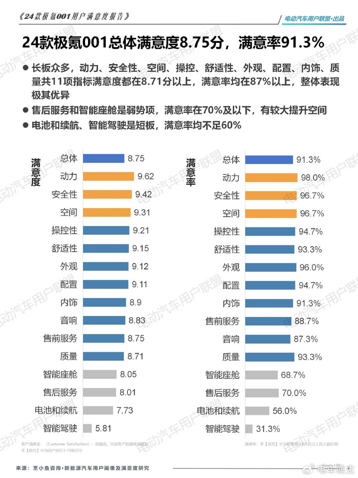 4.24款极氪001总体满意度8.75分,总体满意率91.3%。长板众多,动力、安全性、空间、操控、舒适性、外观、配置、内饰、质量这9项指标满意率均在90%以上,整体表现极其优异;智能座舱和售后服务是弱势项,满意率在70%及以下;电池和续航、智能驾驶是短板,满意率不及60%。