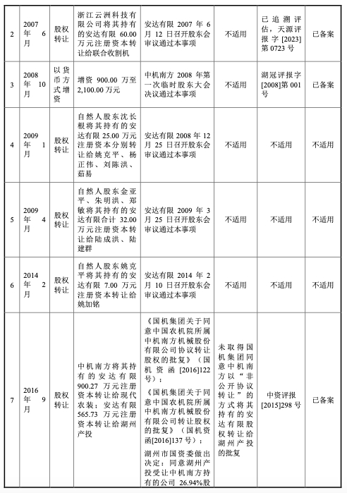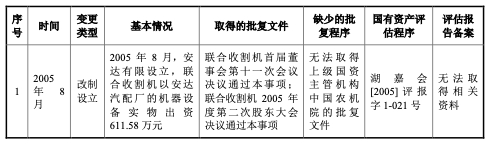 2)联合收割机发起设立安达有限时,已委托湖州嘉业会计师事务所对其用于出资的非货币资产进行评估,并出具了《湖州安达汽车配件厂单项资产评估报告书》(湖嘉会(2005)评报字 1-021 号)。根据《国有资产评估管理若干问题的规定》的规定,上述评估报告应履行备案程序。公司无法取得联合收割机就上述评估报告办理备案手续的证明材料。
