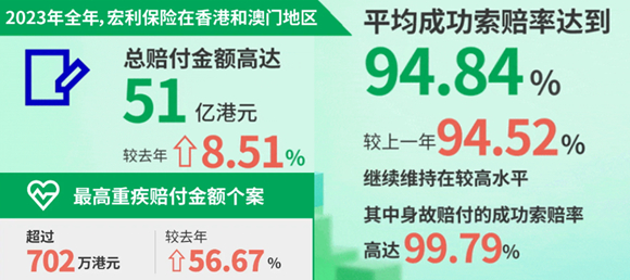 宏利不仅索赔流程方便,理赔表现也同样出色。在2023年宏利批出的赔偿额超过51亿港元,平均成功索偿率高达94.84%,这强有力地证明了宏利的实力能让客户及时获得应有的保障。