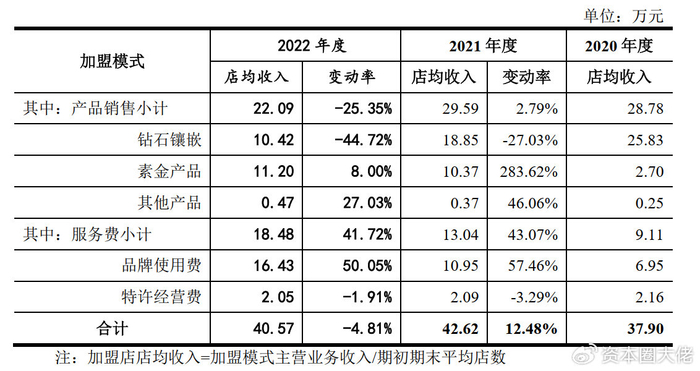 可见,从2021年开始,周六福对于加盟收入高占比情况进行了一定的调整,但是加盟模式依旧为其主要业务模式。